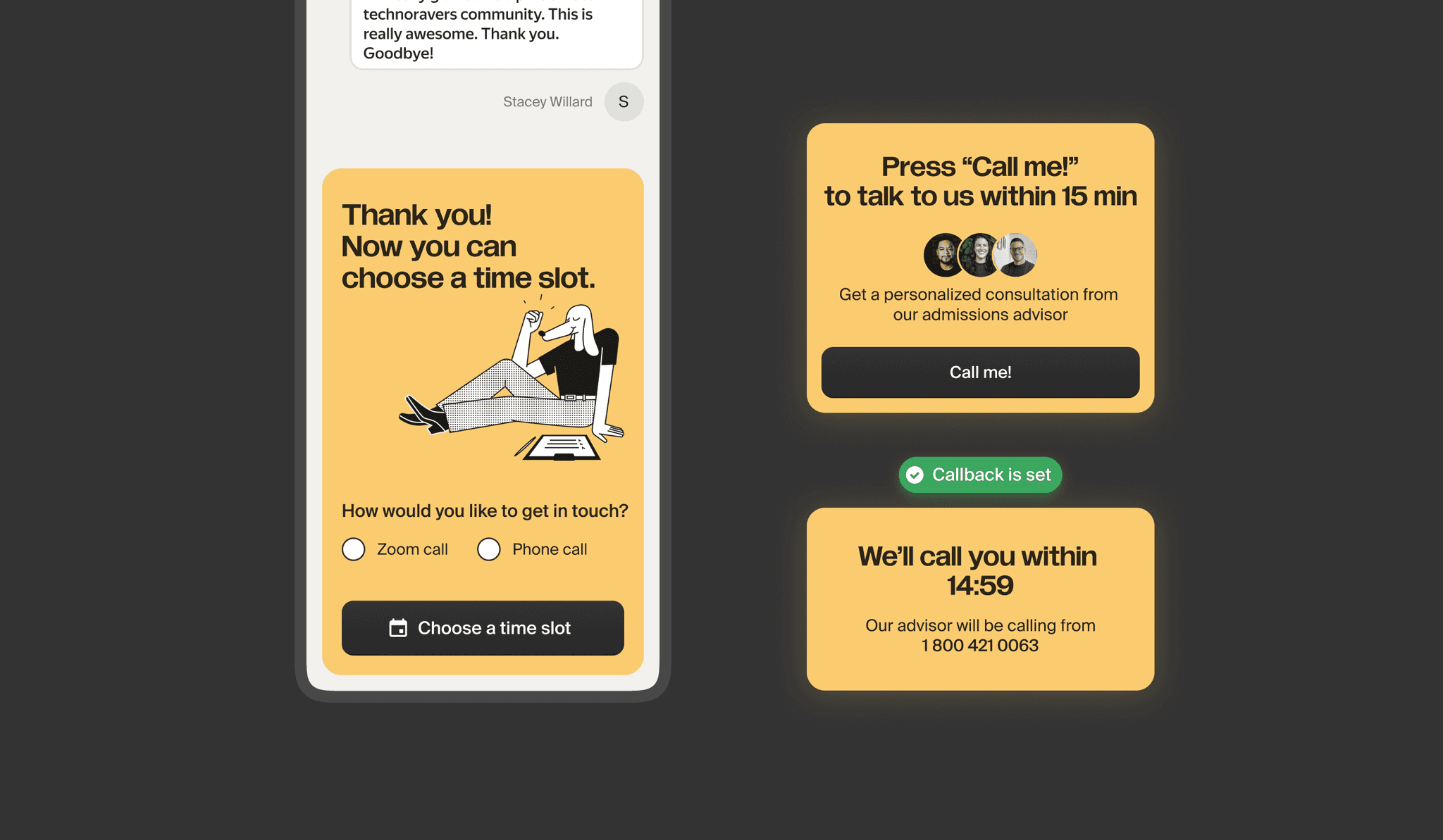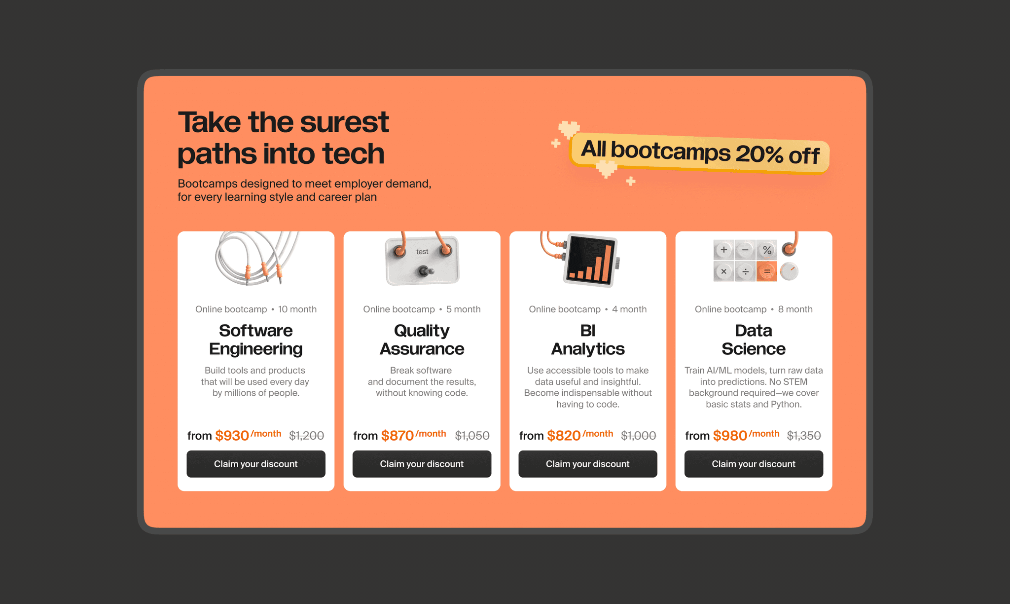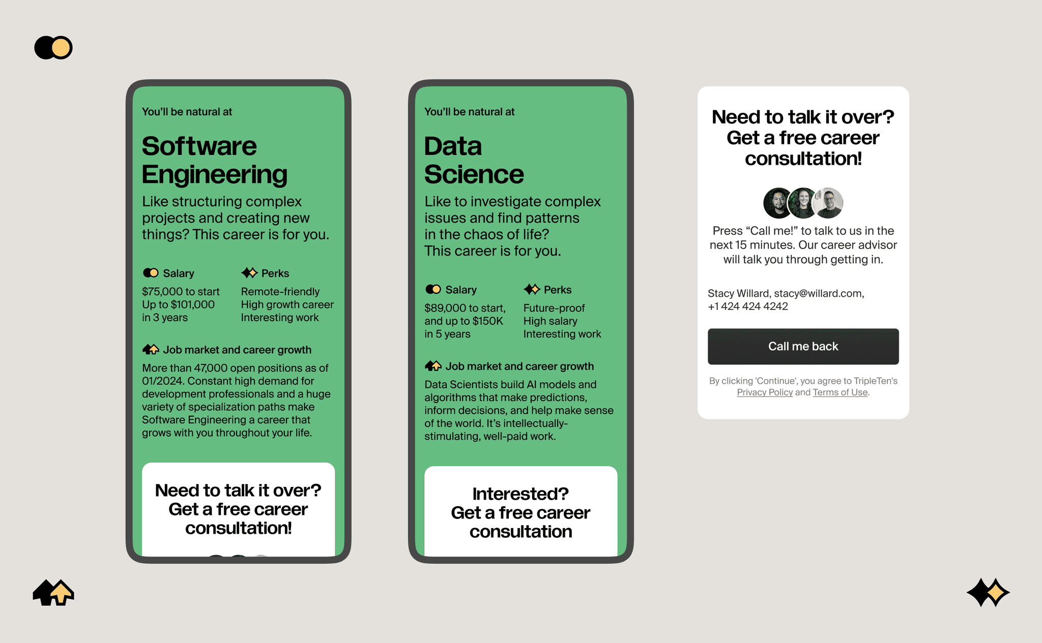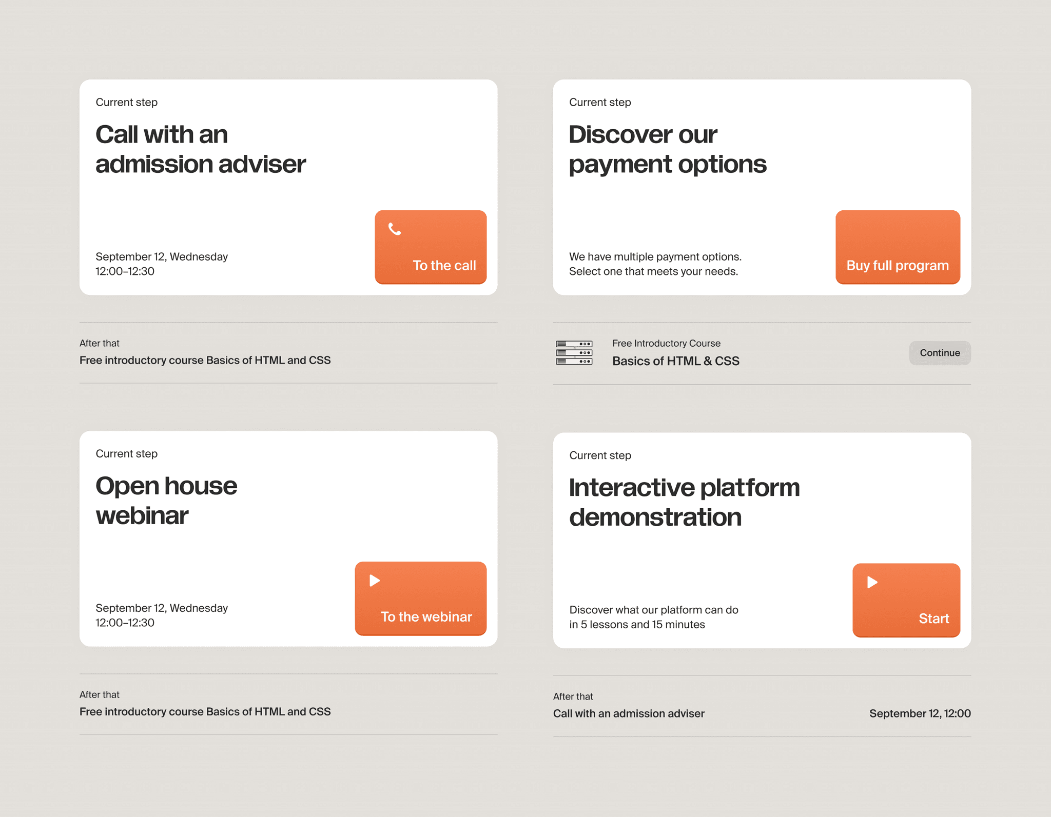 The scoring system interface was reused in the Career Quiz, another sales funnel. Previously, it was built on a third-party service. Moving it into our code base allowed us to collect more accurate analytics and ensured consistency in UX and UI.