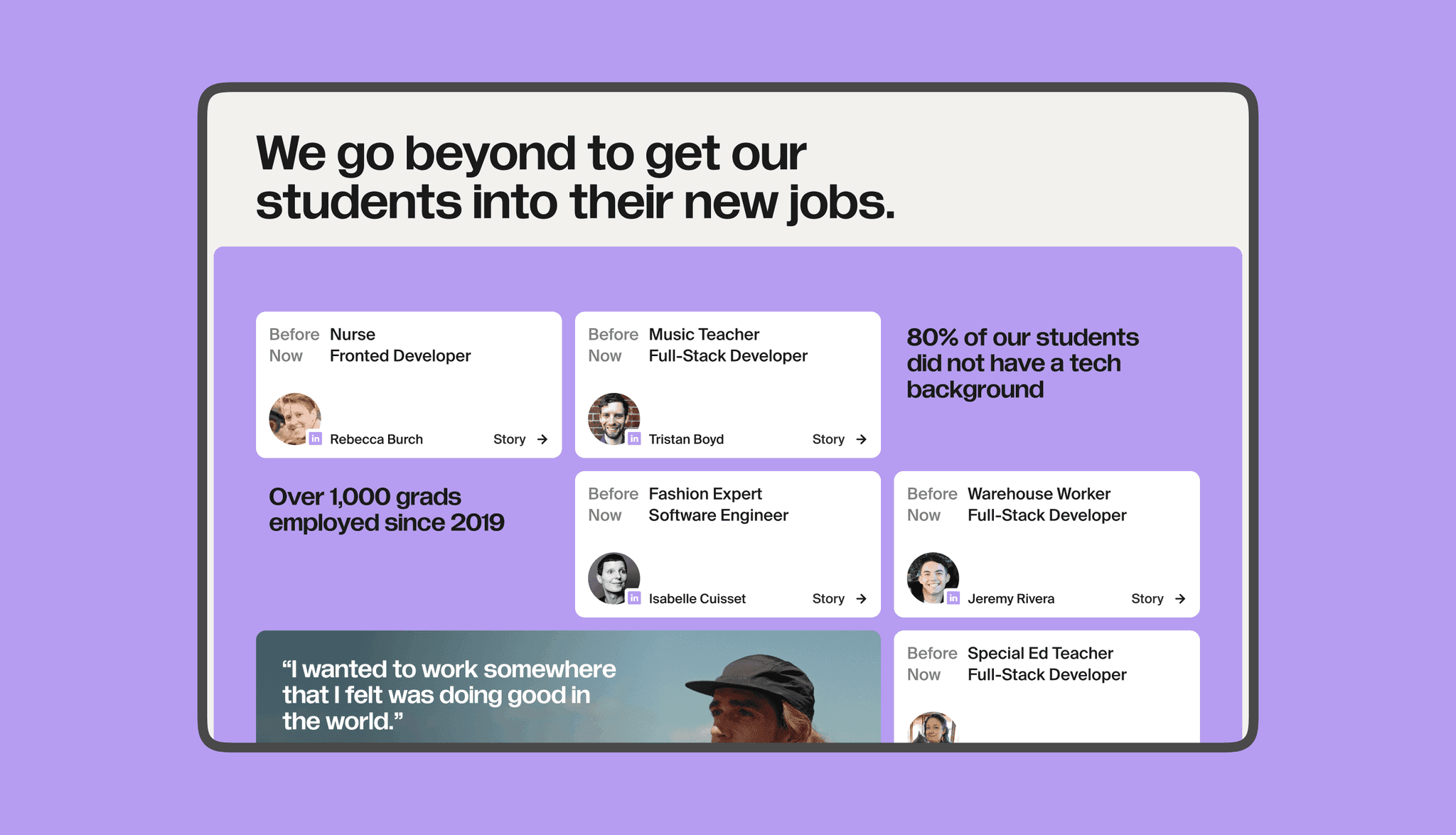 Various web pages for company information, motivational materials about students, and lead funnels.