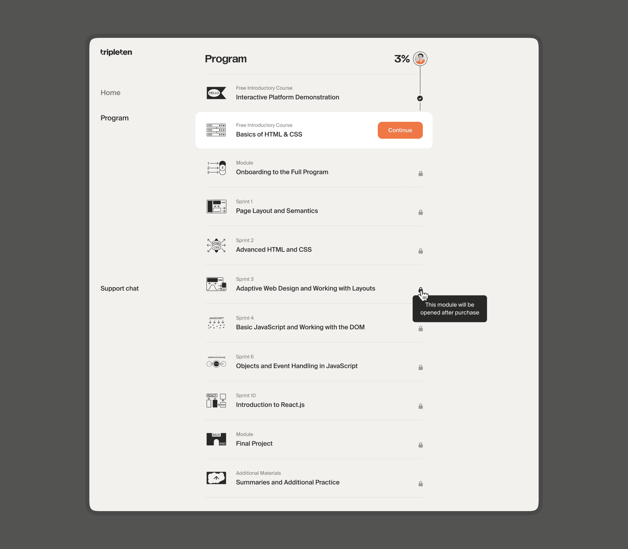 The TripleTen platform includes many features: a built-in code editor, theory lessons, a learning calendar, an AI assistant, and more. Our idea was to create a step-by-step flow that showcases these features one by one, gradually unveiling the full capabilities of the Platform.