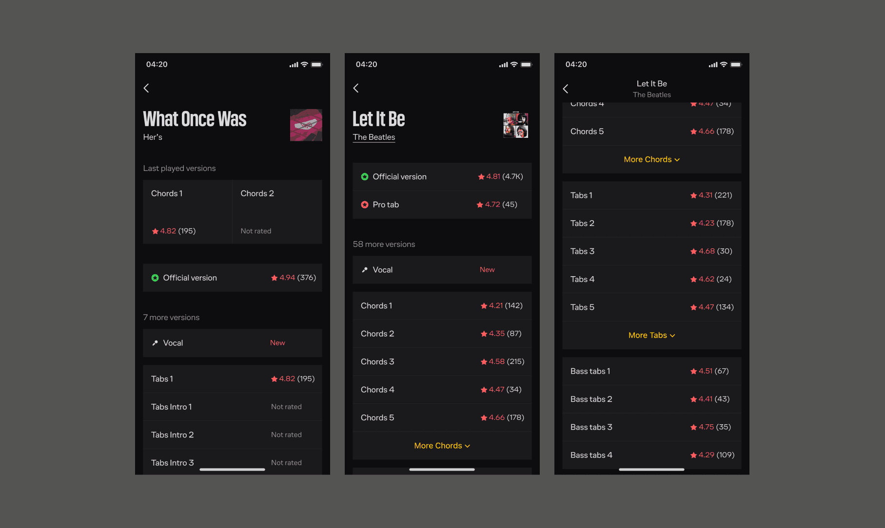 Ultimate Guitar is a library of millions of songs from tens of thousands of artists. Each song can contain multiple versions, such as different tones, chords, tabs, and separate song parts. I worked on various sections of the app to improve the search experience, helping users find the version they need.